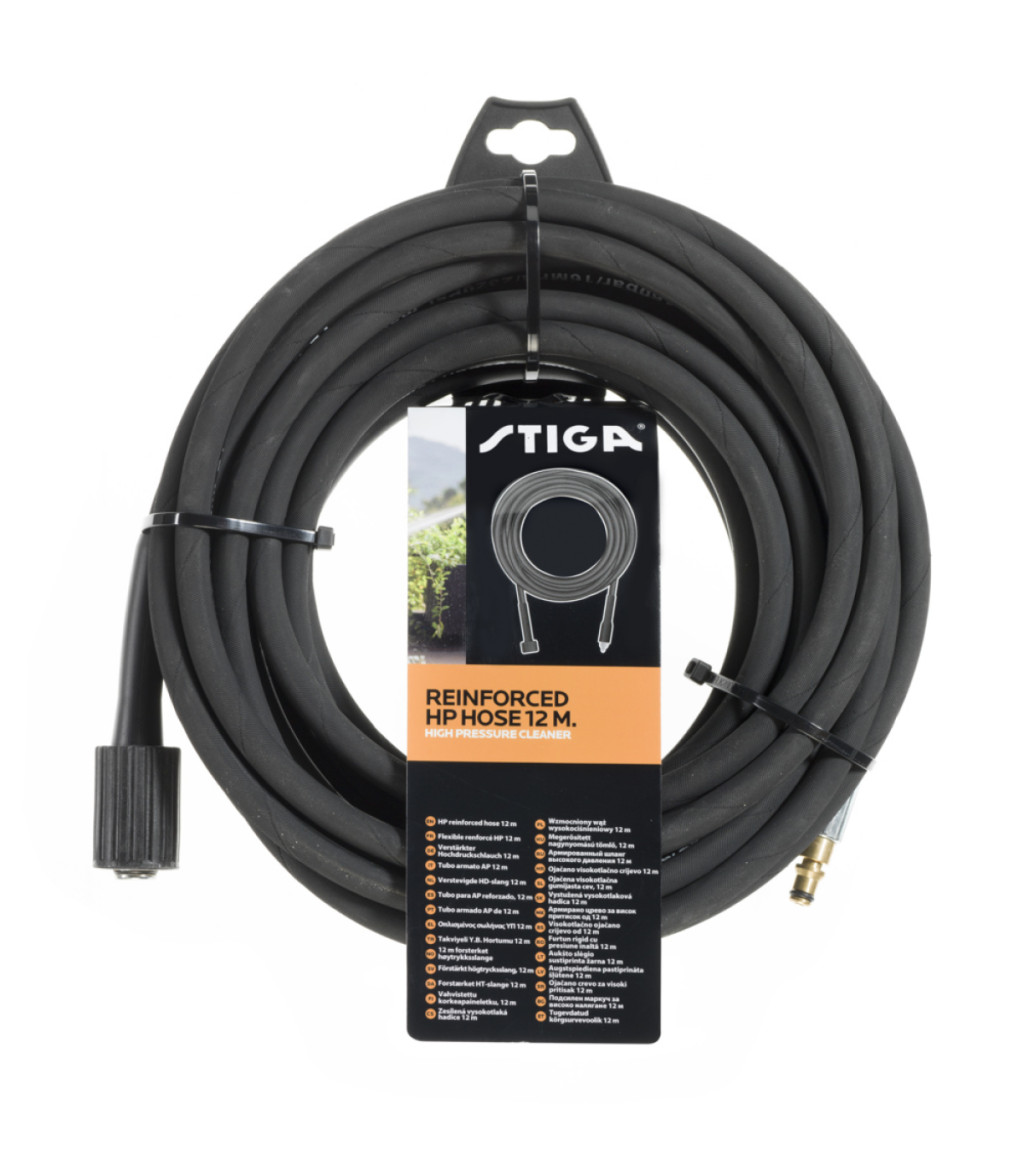 Megerősített nagynyomású 12 m-es cső. A maximális víznyomás 160 bar/16 MPa és a maximális bemeneti vízhőmérséklet 60°C/140°F. A készlet kompatibilis az összes STIGA 550 R és HPS 650 RG magasnyomású mosó modellel.